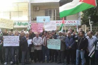Displaced residents of the Yarmouk camp in Lebanon sit-in in front of the UNRWA Office in Tripoli.
